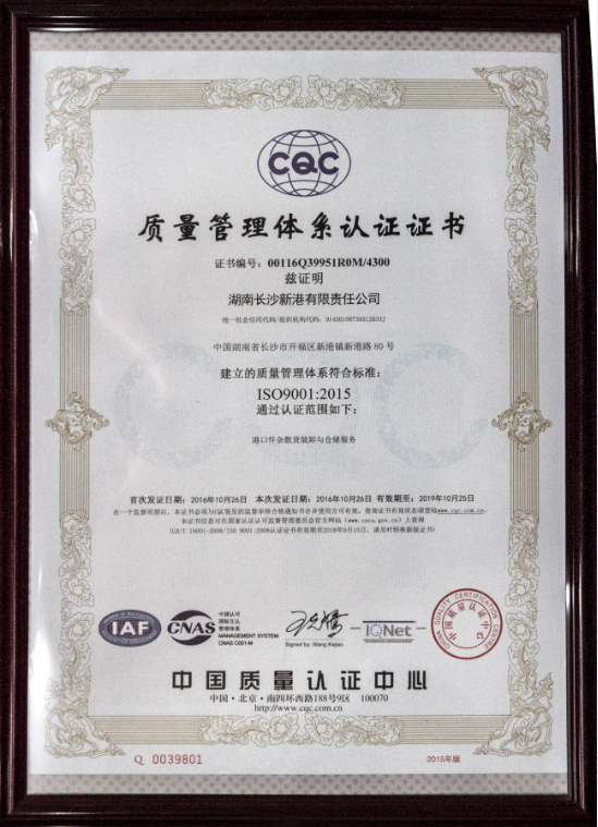 通過(guò)兩個(gè)月的試運行,5位評審專(zhuān)家于10月9日對公司ISO9001:2015質(zhì)量管理體系進(jìn)行了認證評審。經(jīng)過(guò)嚴格審核,評審專(zhuān)家認為公司編制的《質(zhì)量安全管理流程手冊》規范科學(xué),切合企業(yè)實(shí)際,在試運行中取得了較好的效果,一致通過(guò)我公司的認證資格。中國檢驗認證集團湖南有限公司于10月26日正式頒發(fā)新港公司ISO9001:2015質(zhì)量管理體系證書(shū)。