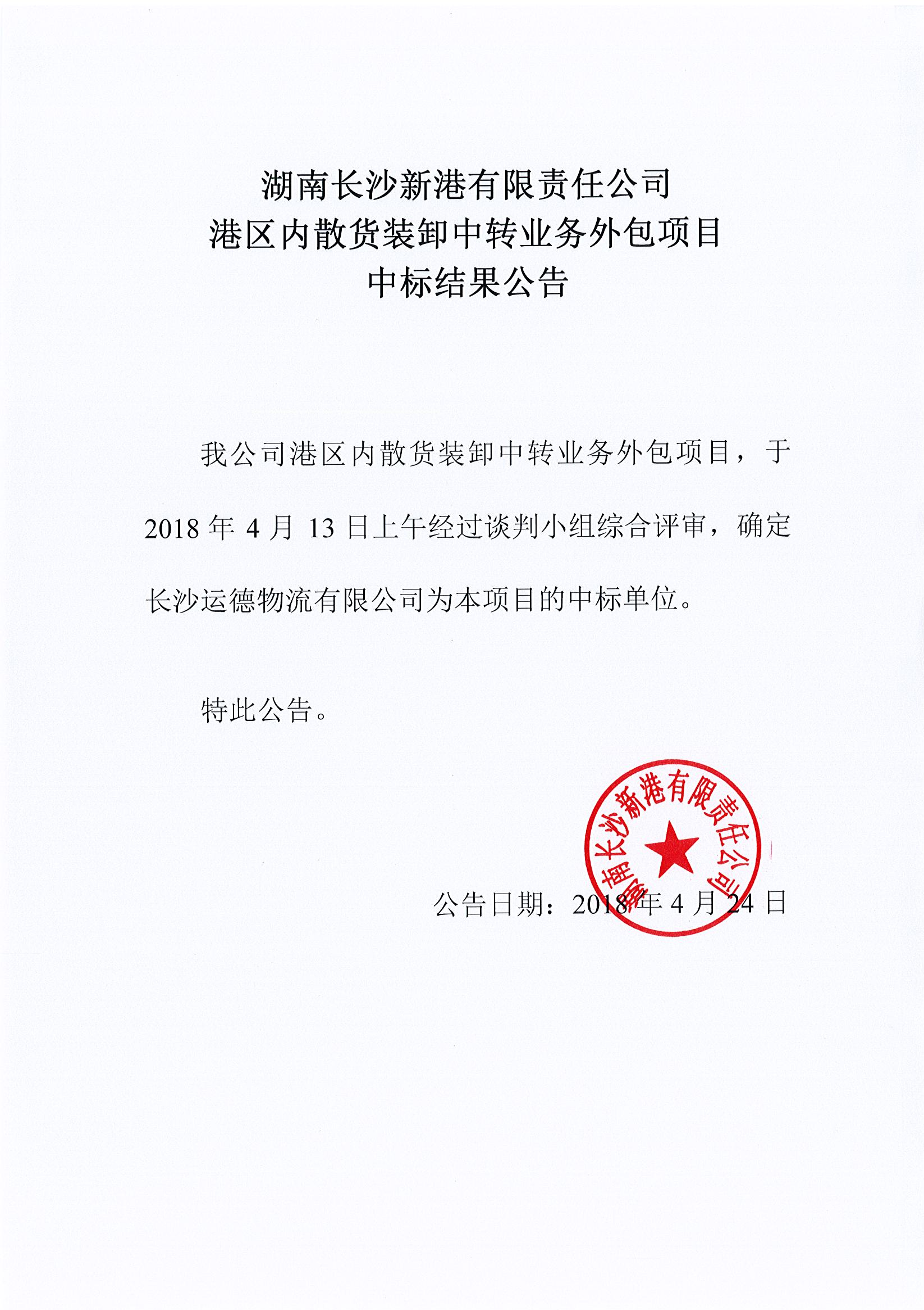 湖南長(cháng)沙新港有限責任公司 港區內散貨裝卸中轉業(yè)務(wù)外包中標結果公告