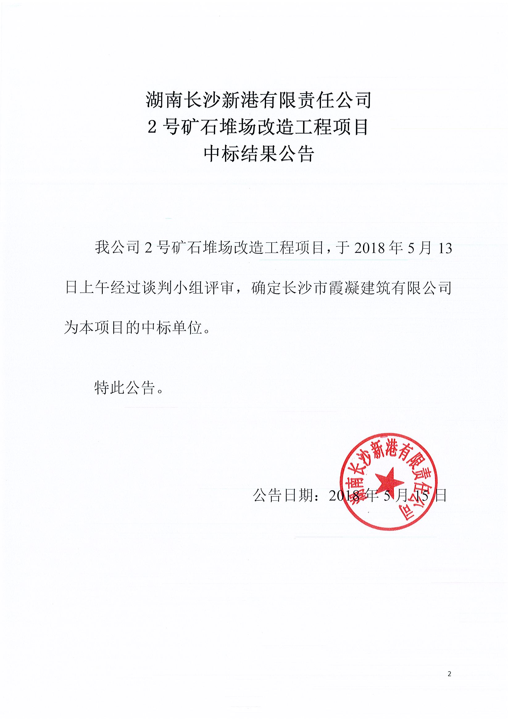 湖南長(cháng)沙新港有限責任公司 2號礦石堆場(chǎng)改造工程項目中標結果公告