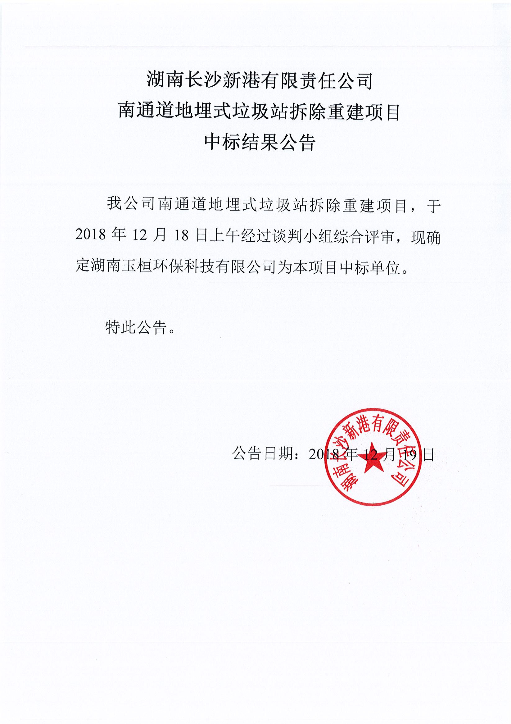 湖南長(cháng)沙新港有限責任公司 南通道地埋式垃圾站拆除重建項目中標公告
