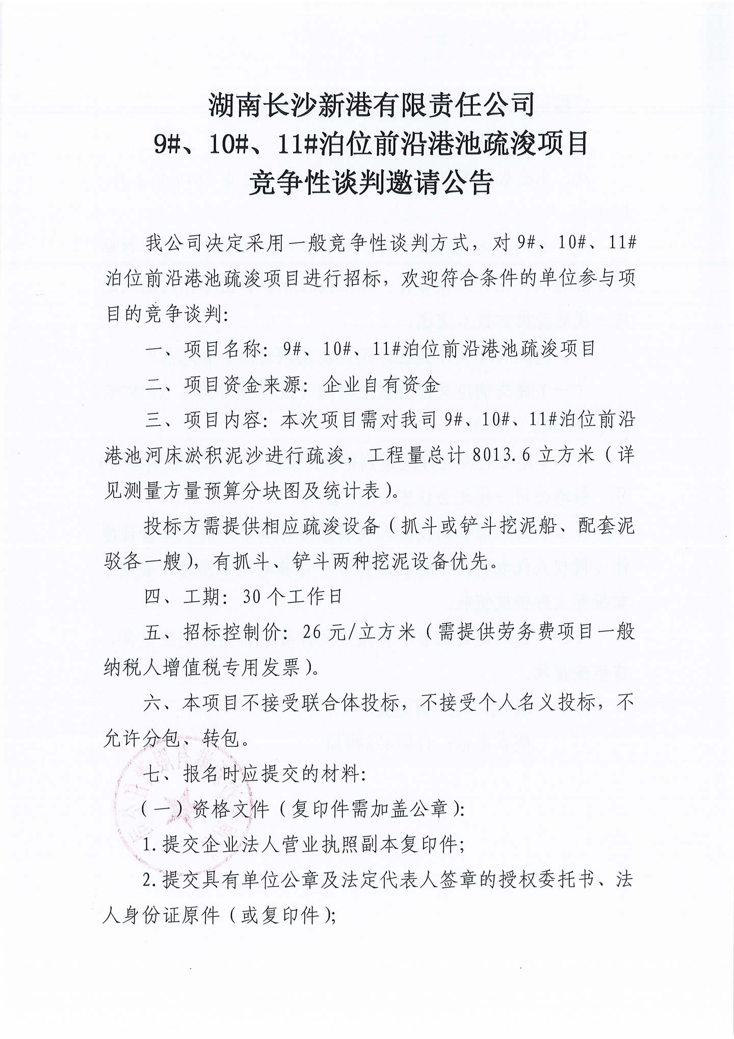 湖南長(cháng)沙新港有限責任公司 9#、10#、11#泊位前沿港池疏浚項目競爭性談判邀請公告
