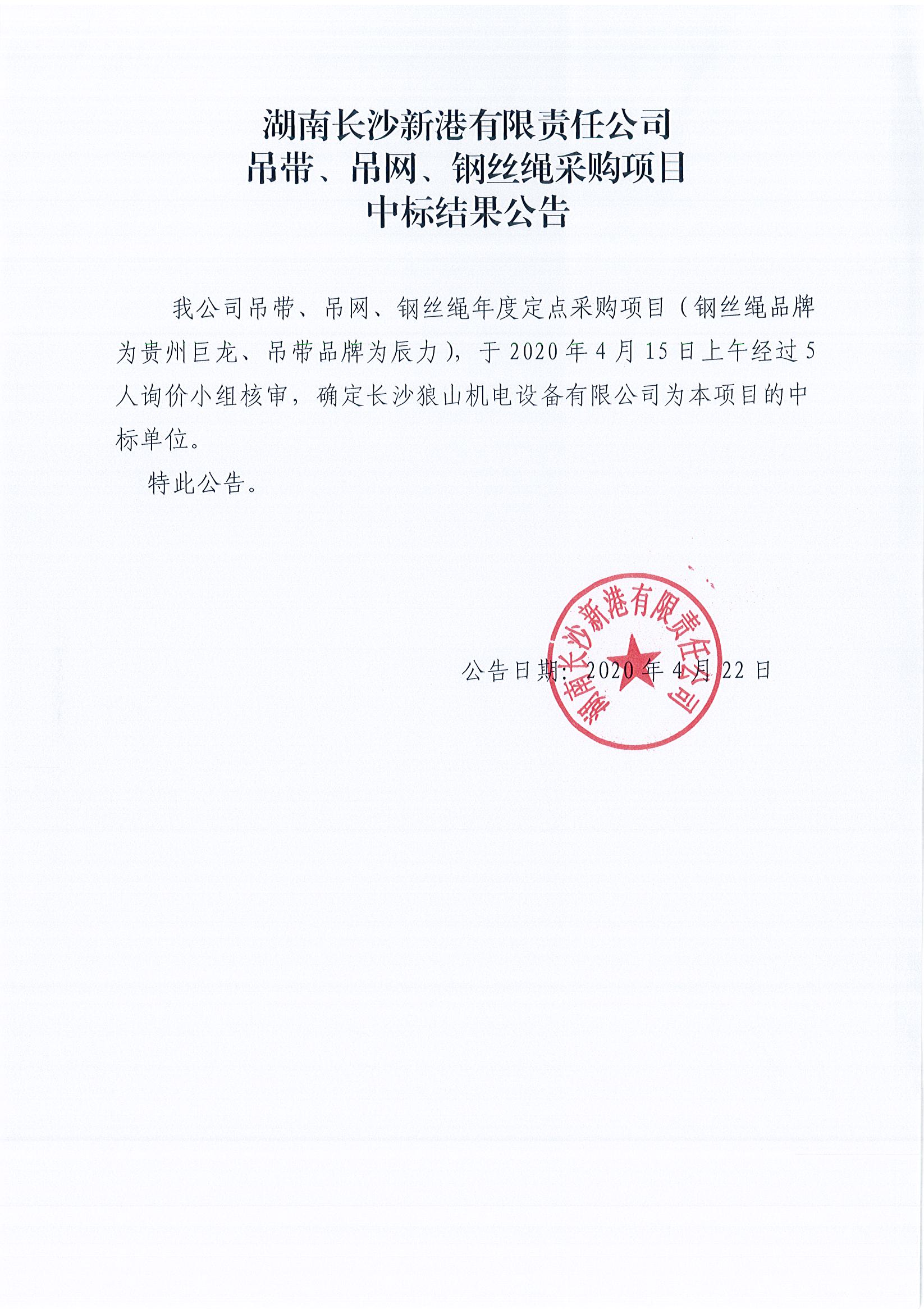 湖南長(cháng)沙新港有限責任公司吊帶、吊網(wǎng)、鋼絲繩采購項目中標結果公告