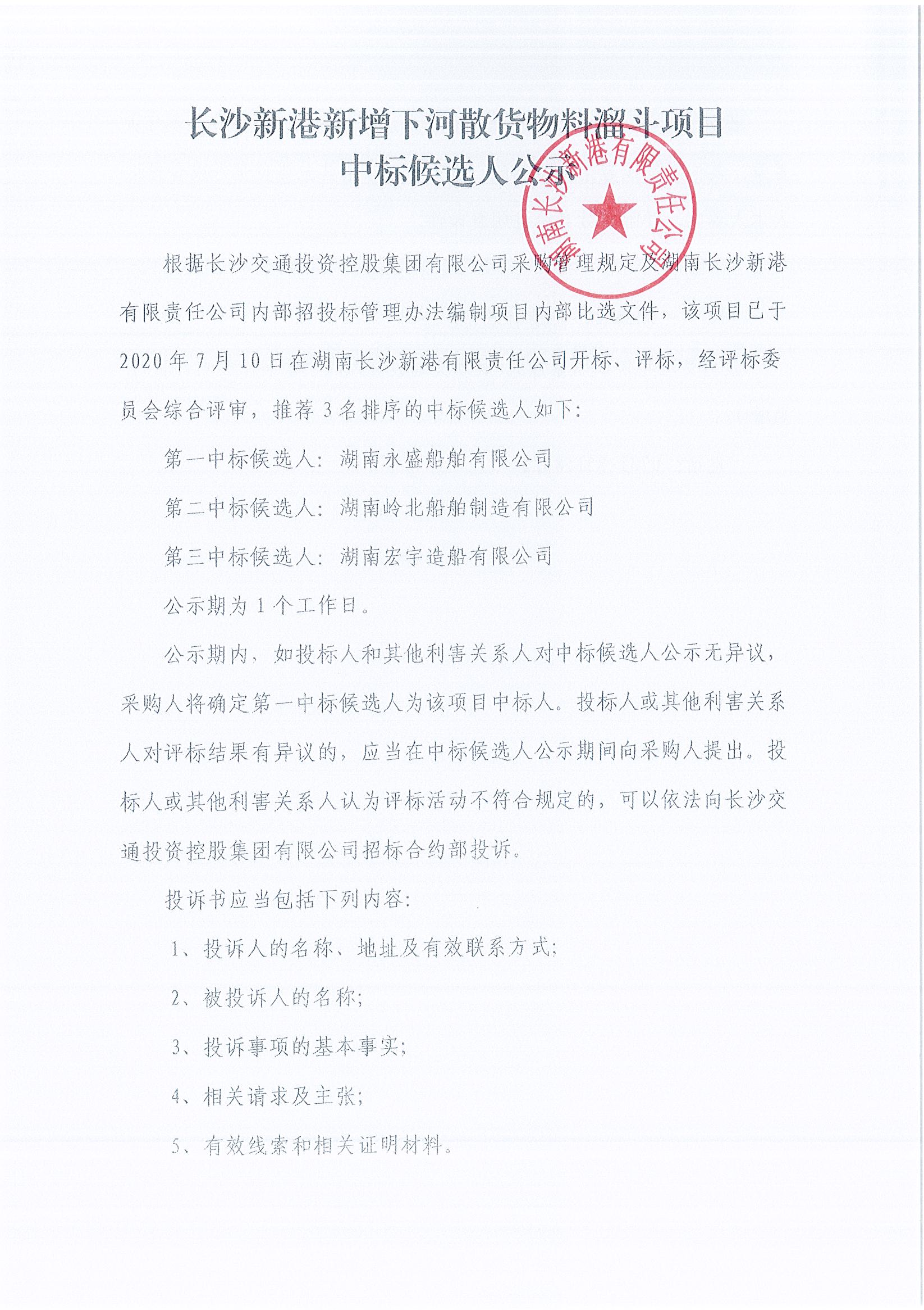 長(cháng)沙新港新增下河散貨物料溜斗項目中標候選人公示