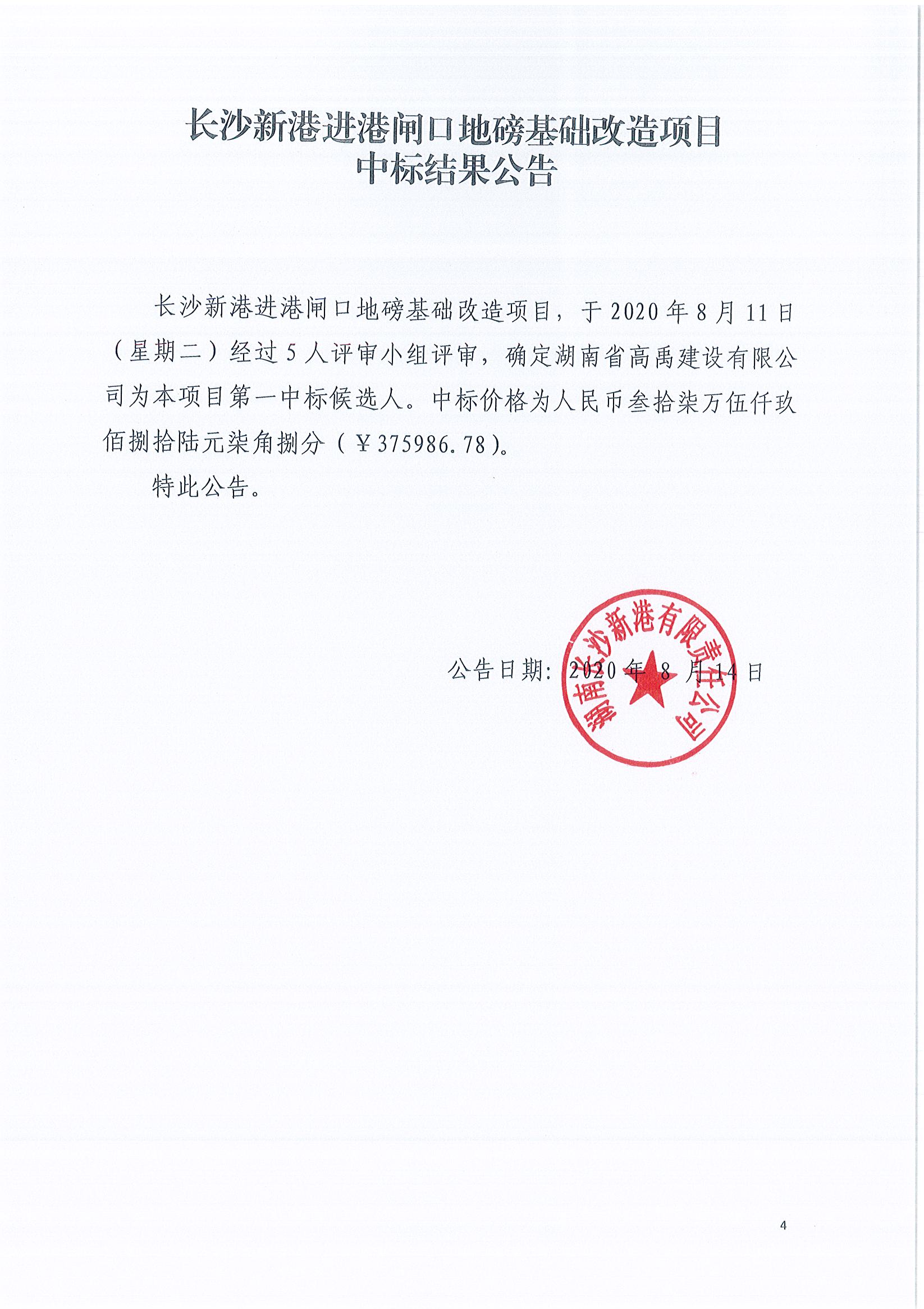 長(cháng)沙新港進(jìn)港閘口地磅基礎改造項目中標結果公告
