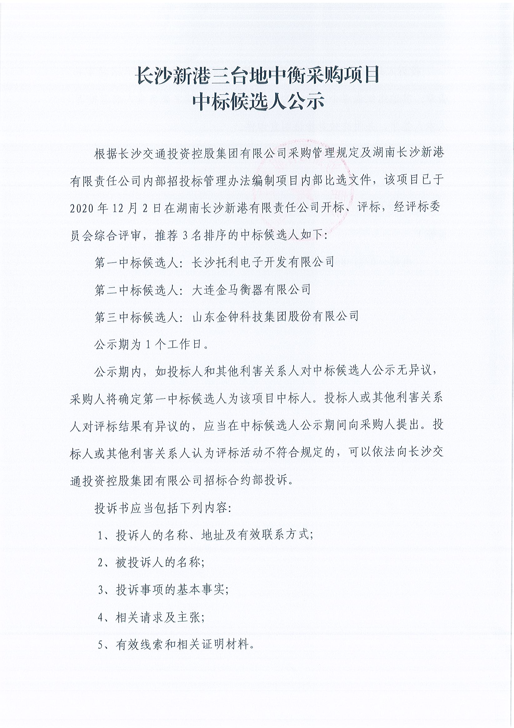 長(cháng)沙新港三臺地中衡采購項目中標候選人公示
