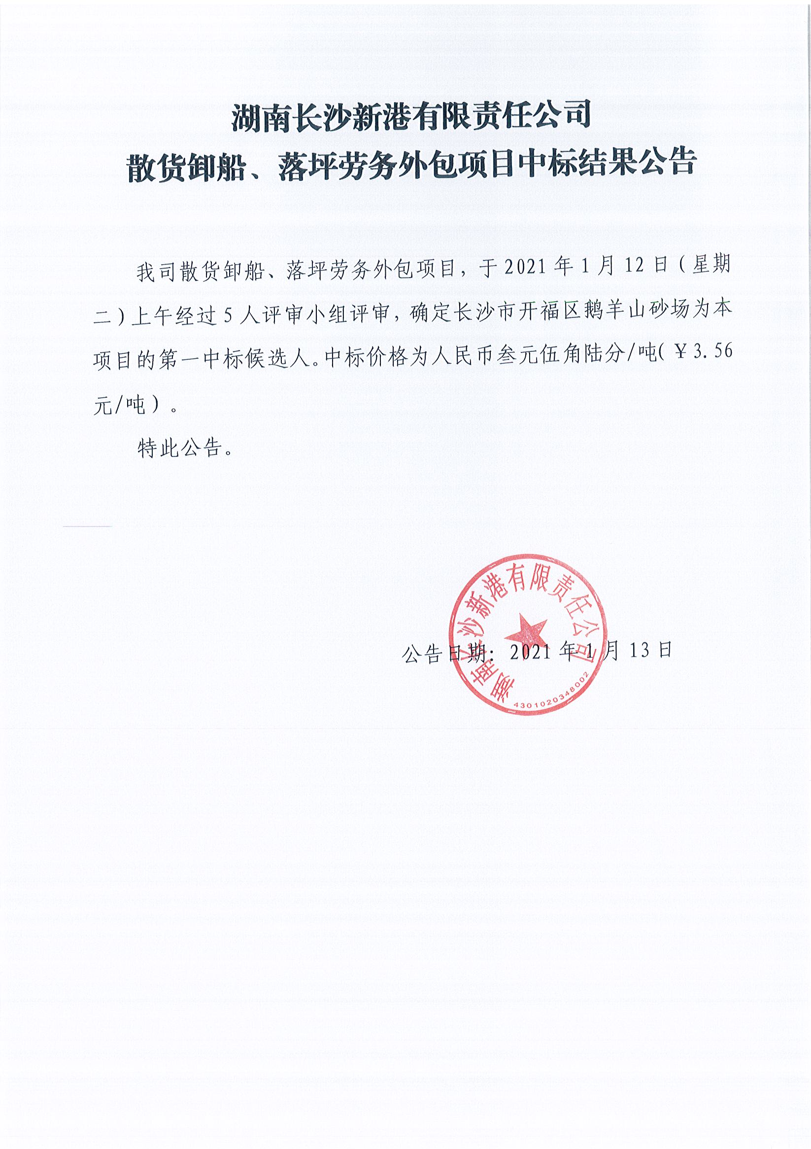 湖南長(cháng)沙新港有限責任公司散貨卸船、落坪勞務(wù)外包項目中中標結果公示