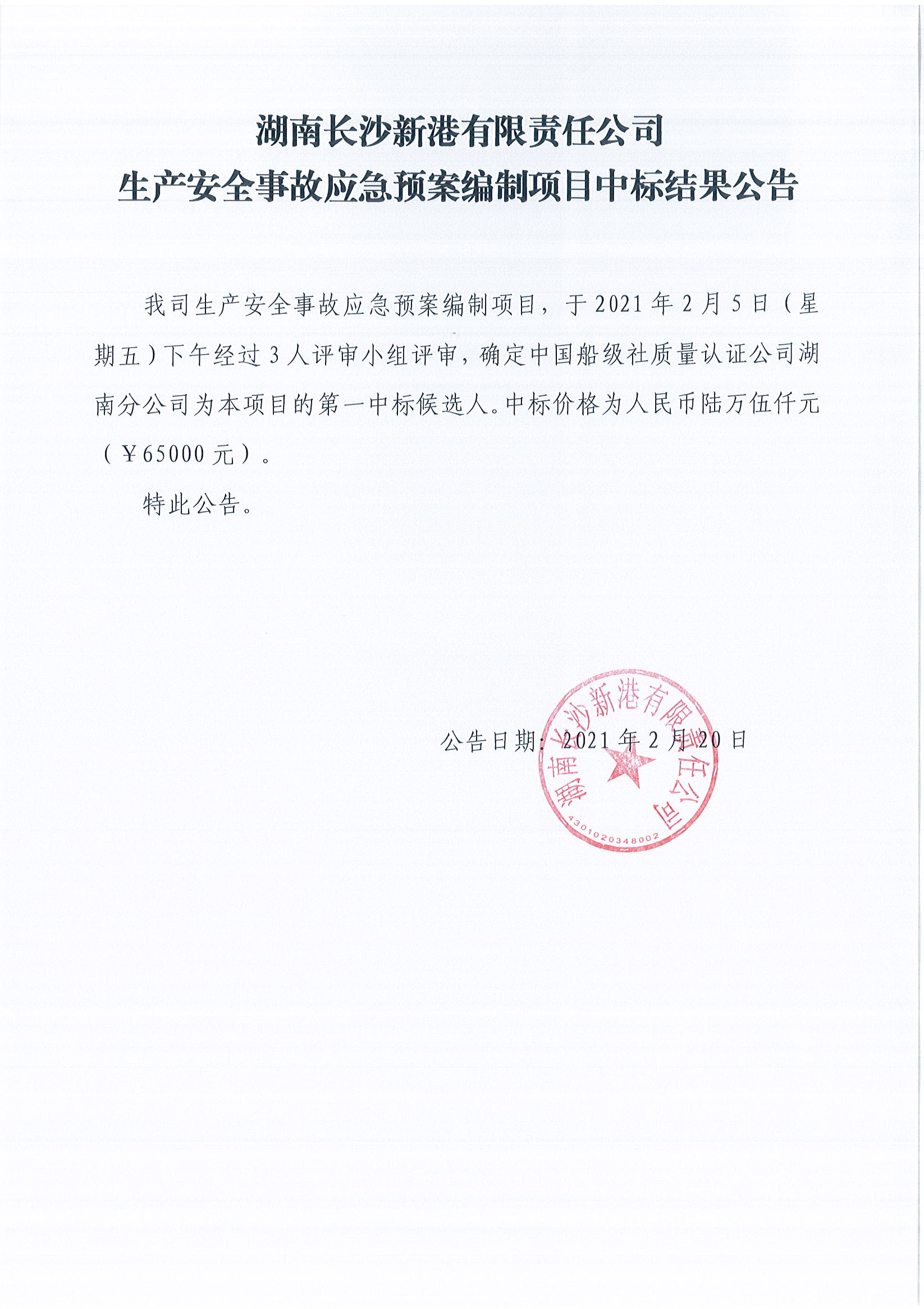 湖南長(cháng)沙新港有限責任公司生產(chǎn)安全事故應急預案編制項目中標結果公告
