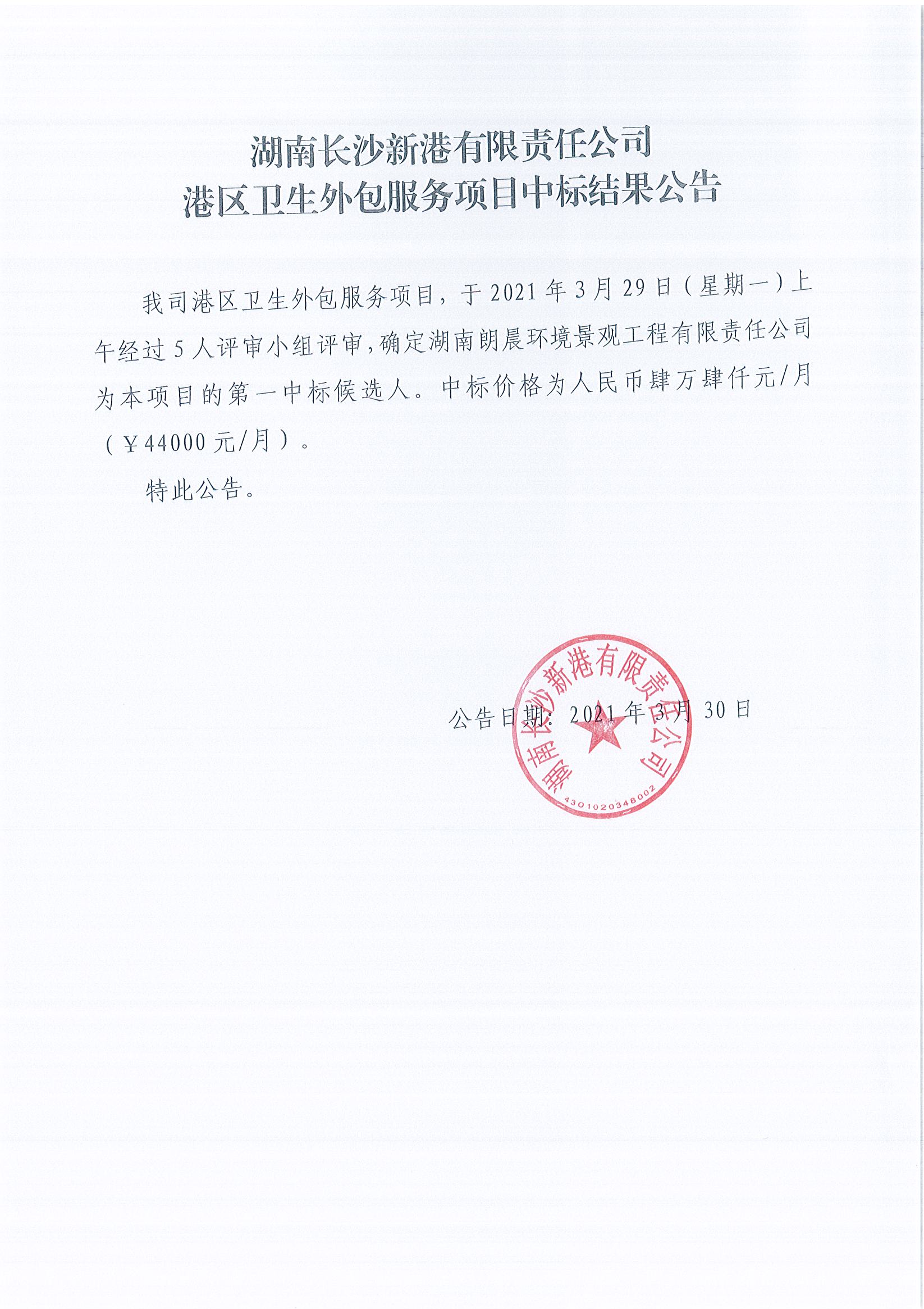 湖南長(cháng)沙新港有限責任公司港區衛生外包服務(wù)項目中標結果公告