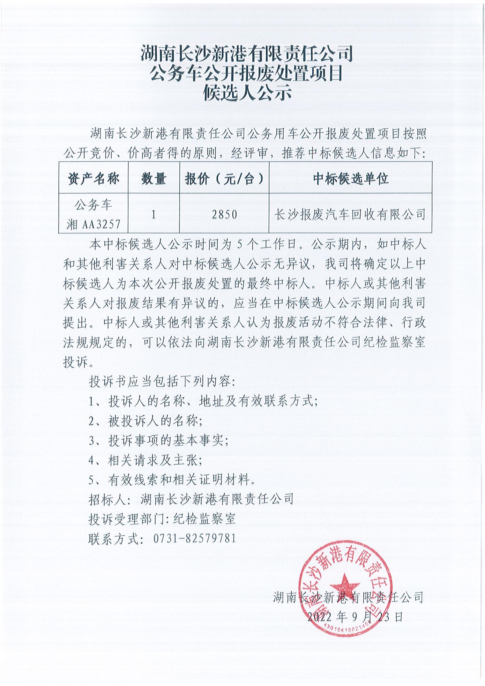 湖南長(cháng)沙新港有限責任公司公務(wù)車(chē)公開(kāi)報廢處置項目候選人公示