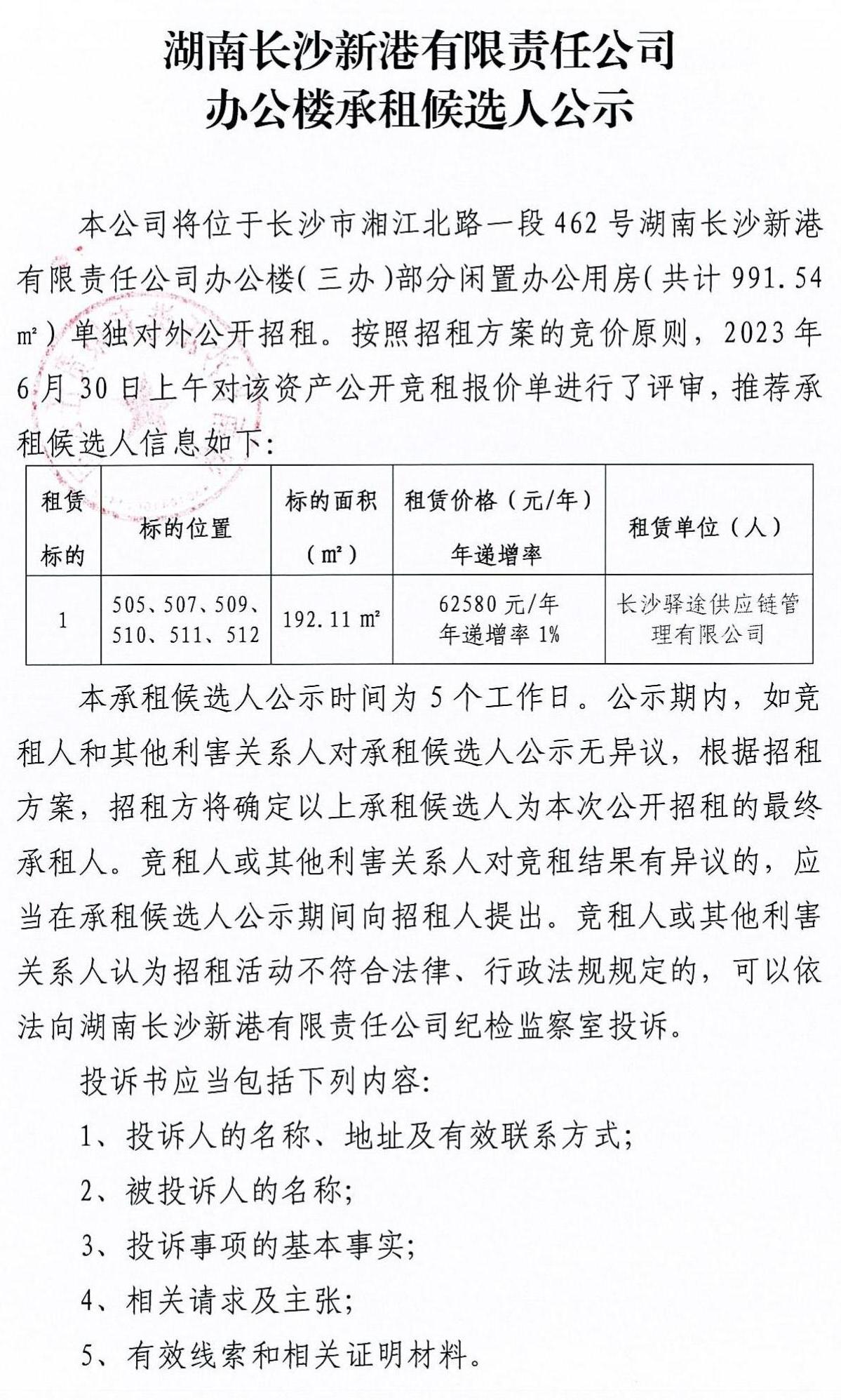 湖南長(cháng)沙新港有限責任公司辦公樓承租候選人公示