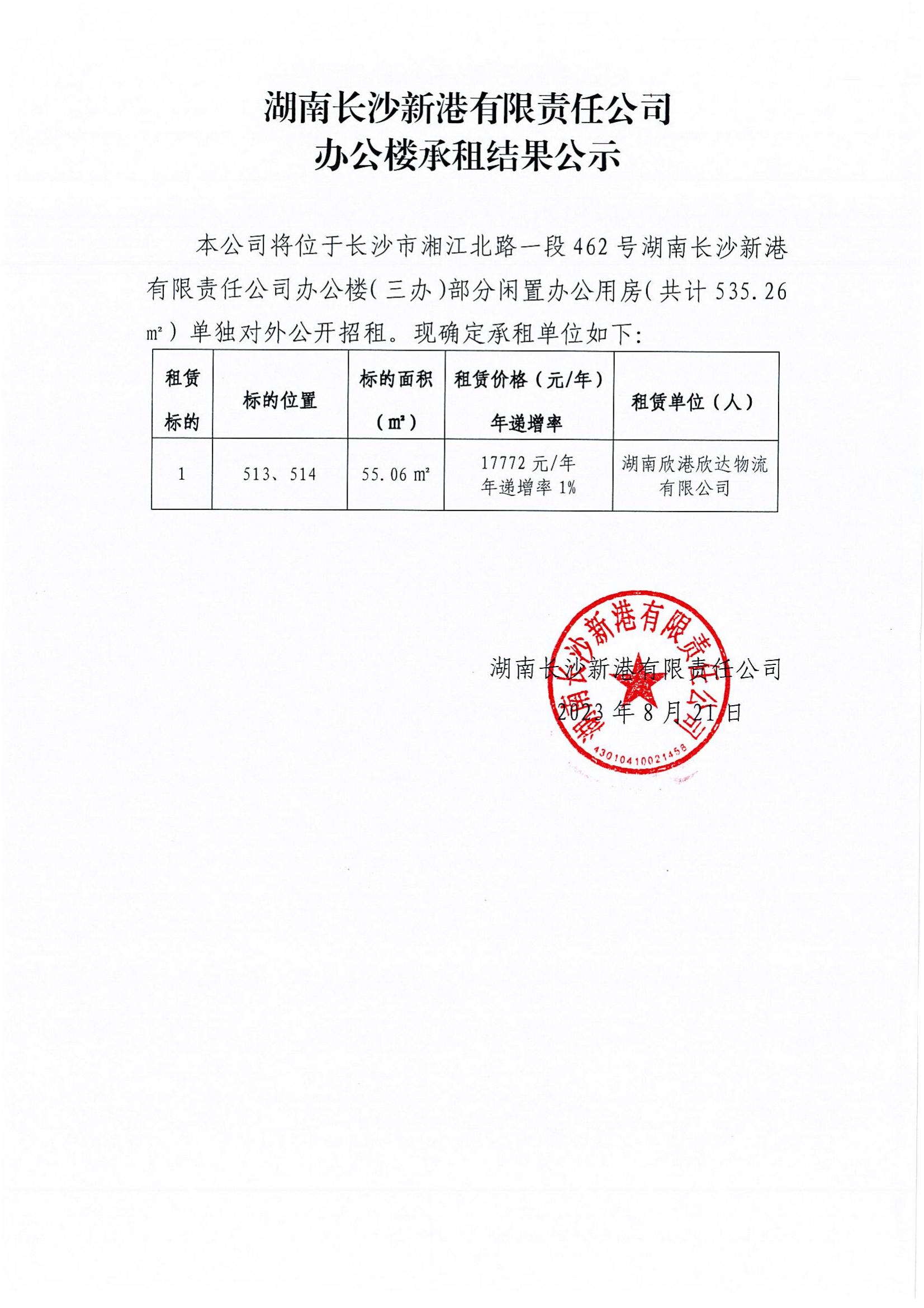 湖南長(cháng)沙新港有限責任公司辦公樓承租結果公示