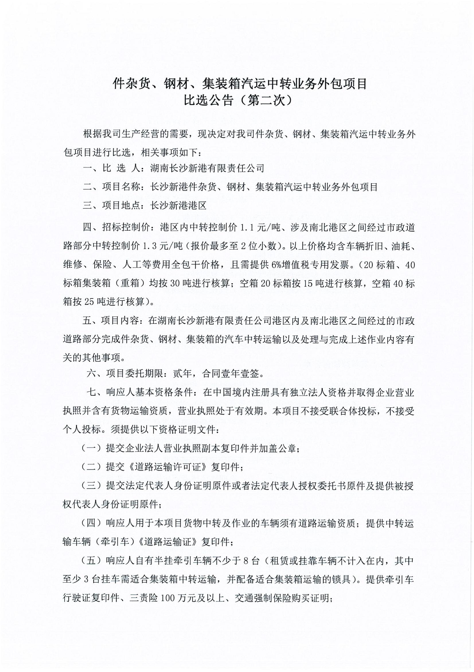 件雜貨、鋼材、集裝箱汽運中轉業(yè)務(wù)外包項目比選《比選公告(第二次)》