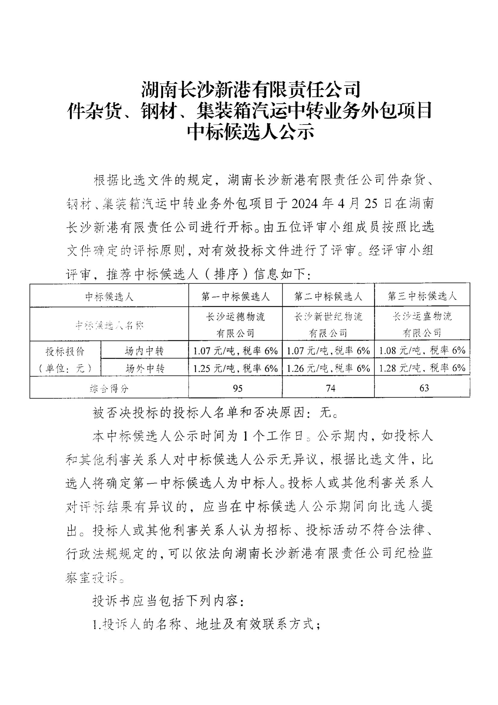 件雜貨、鋼材、集裝箱汽運中轉業(yè)務(wù)外包項目中標候選人公示