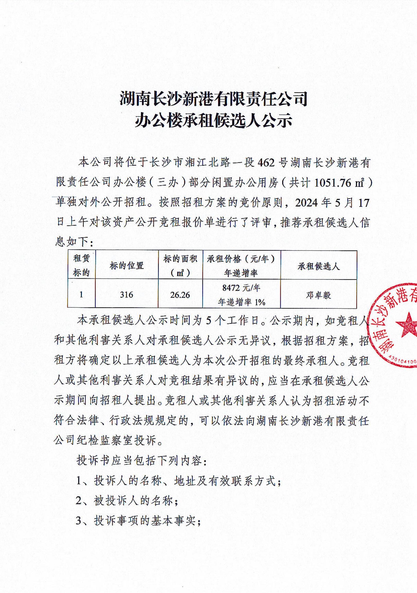 湖南長(cháng)沙新港有限責任公司辦公樓承租候選人公示