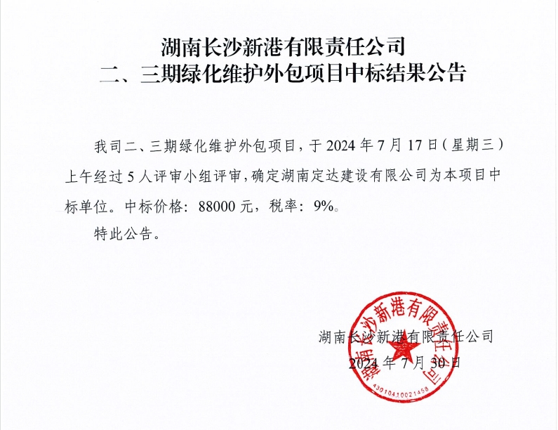 湖南長(cháng)沙新港有限責任公司二、三期綠化維護外包項目中標結果公告