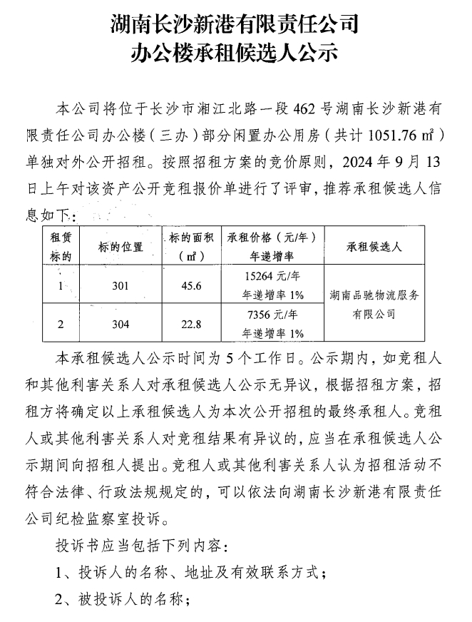 湖南長(cháng)沙新港有限責任公司辦公樓承租候選人公示